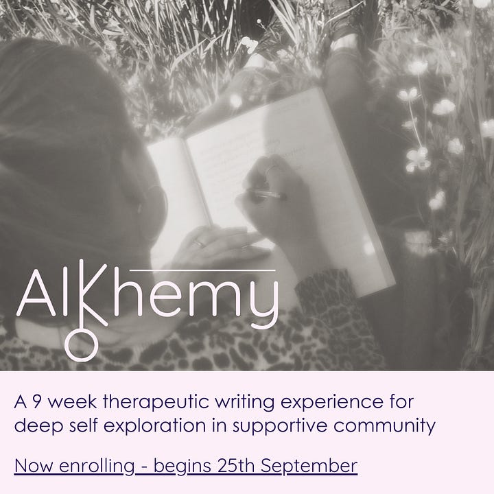 On that note, I’m delighted that Alchemy also returns this Autumn for the third time since launching in 2023. Alchemy is my 9 week therapeutic writing course, live, immersive and online, that uniquely interweaves community and one-to-one support. The result is a soundly supported experience offering insight, release and deep self-awareness through writing and exchange, with the hope and intention that your life around and beyond the course is energised and enriched.